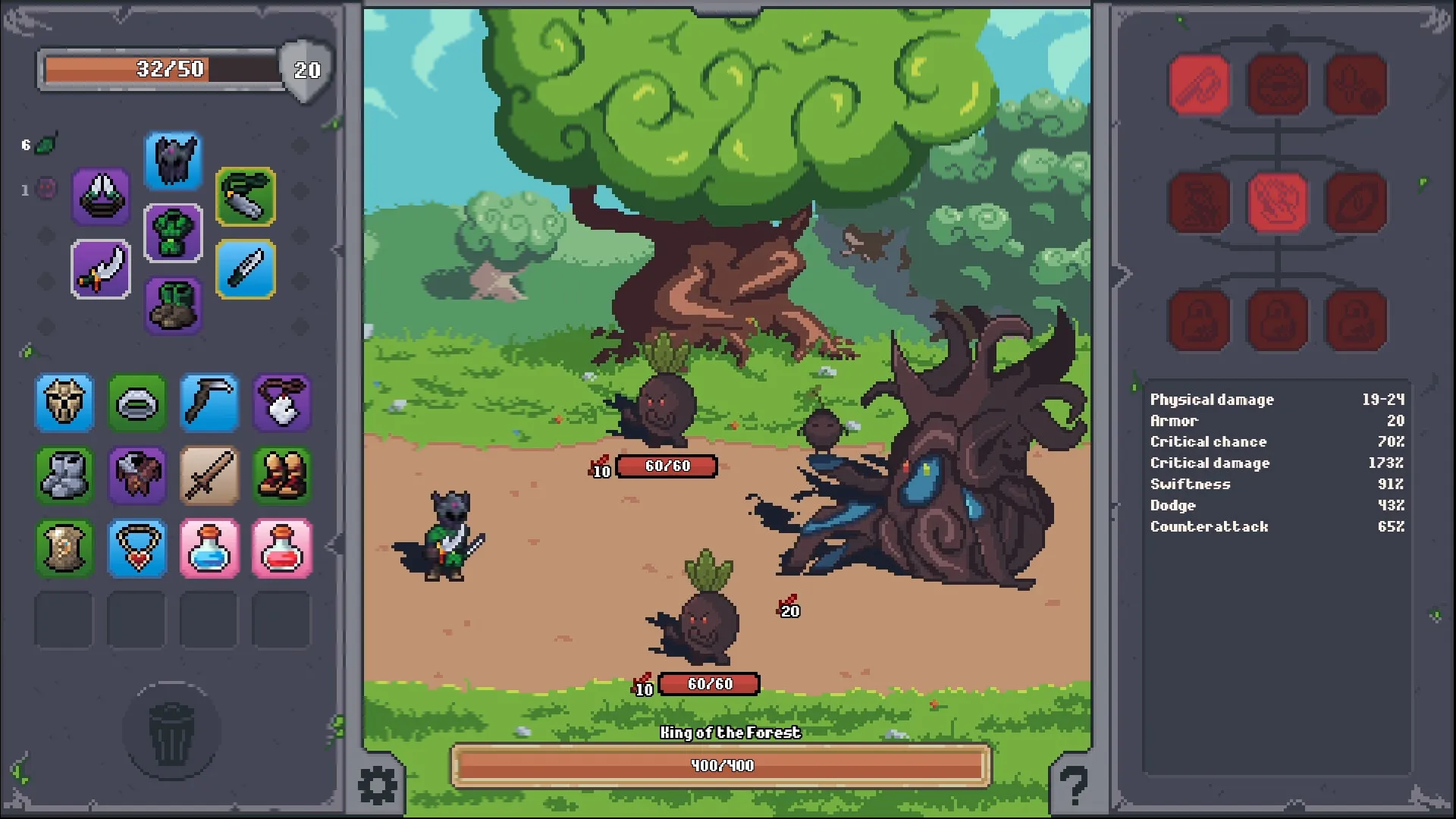 Bosses provide real challenges. One prominent example is a tree boss that, if the conditions are right, creates an additional mob (“ad”) on its fifth turn, enhancing the attack of those mobs—a tactical dilemma that requires you to choose between hitting the boss and the ads.